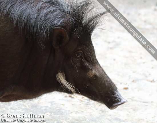 The Philippine warty pig is medium-sized among wild pigs in the Philippines - larger than the Visayan warty pig (Sus cebifrons) and smaller than the Palawan bearded pig (Sus ahoenobarbus) based on skull measurements. The overall coloration is black or dark brown, with sparse and bristly hair all over the body. Both sexes develop a crest of dark hair from the crown of the head onto their backs; this is especially prominent in mature males. The crest is black or greyish in S. p. philippensis and often flops forward over the face; in S. p. mindanensis, the crest is not directed forward, and it may include reddish or white hairs growing throughout. Males have two pairs of "warty" growths on the face: one pair in front of the eyes (preorbital warts), the other at the angle of the jaw (gonial warts). Females do not have these protuberances, but have a long, thin tuft of white hair where the gonial warts grow in males. Unlike the Visayan warty pig, there is generally no pale band across the snout (if present, it is thin and faint). Males have large canine tusks, which self-sharpen as the upper and lower teeth rub together.