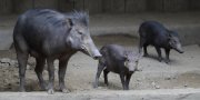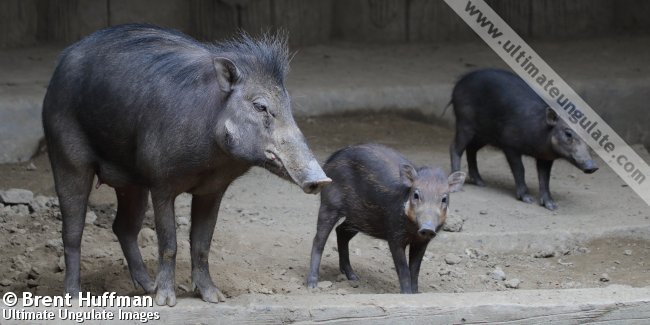 Anecdotal reports suggest that females seek sheltered spots, such as between buttreess roots of tall trees, to give birth. They may also gather grass and twigs to form a circular farrowing nest. Babies are marked with pale stripes typical of young pigs. One report suggests that births in the wild generally occur in April-May, although the captive-born striped young pictured above were photographed in January.