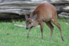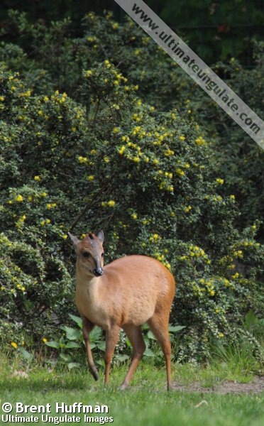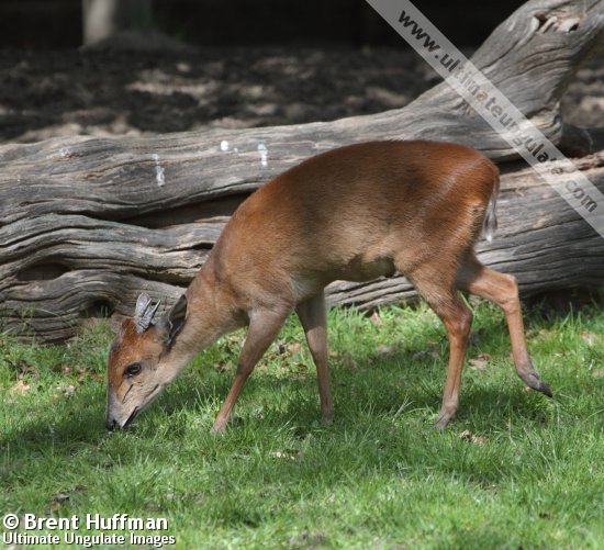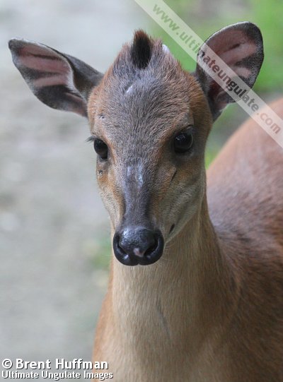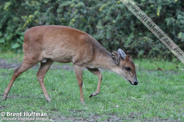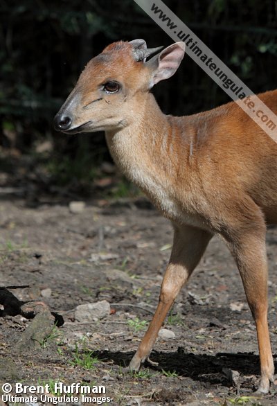The red duiker is relatively small and slender; females tend to be larger and heavier than males. Both sexes are a uniform tawny red, with individuals from the northern part of the species' range being brighter and more rufous. The underparts are typically only slightly paler than the rest of the body. Distinctively, the back of the neck is grayish brown and there is no dorsal stripe. The tail is narrow and has a white tip. The face is slightly darker than the body, the chin is white, and the small ears are bordered with black. A prominent crest of longer hair on the forehead is typically chestnut brown. Both sexes have stout spike-like horn; those of females are short (2-4.5 cm) and may be hidden within the forehead crest. Horns of males are typically 4.5-8.0 cm (up to 10.1 cm) long and have heavily-ringed bases.